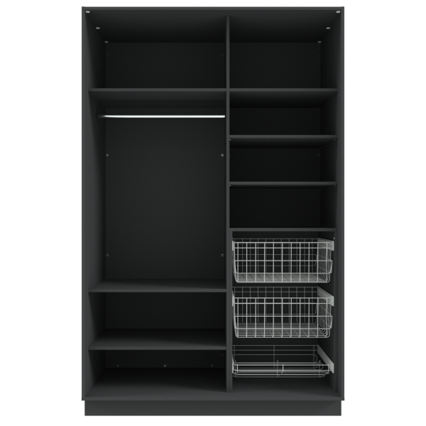 Garderoob Kahe Liuguksega Must Struktuurne Kahe Pesukorvi ja Ühe Jalanõudekorviga paremal.