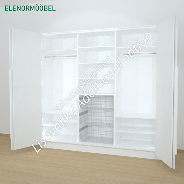 Garderoob valmistatakse Saksa tootja Egger mööbliplaadist. Fassaad ja esipaneelid Egger W1000 ST19 mööbliplaat. Tagasein, vahesinad ja riiulid Egger W960 mööbliplaat.