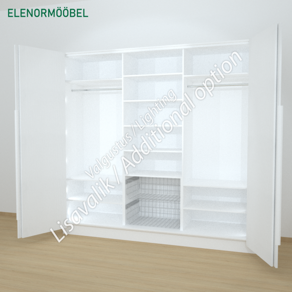 Garderoob valmistatakse Saksa tootja Egger mööbliplaadist. Fassaad ja esipaneelid Egger W1000 ST19 mööbliplaat. Tagasein, vahesinad ja riiulid Egger W960 mööbliplaat.
