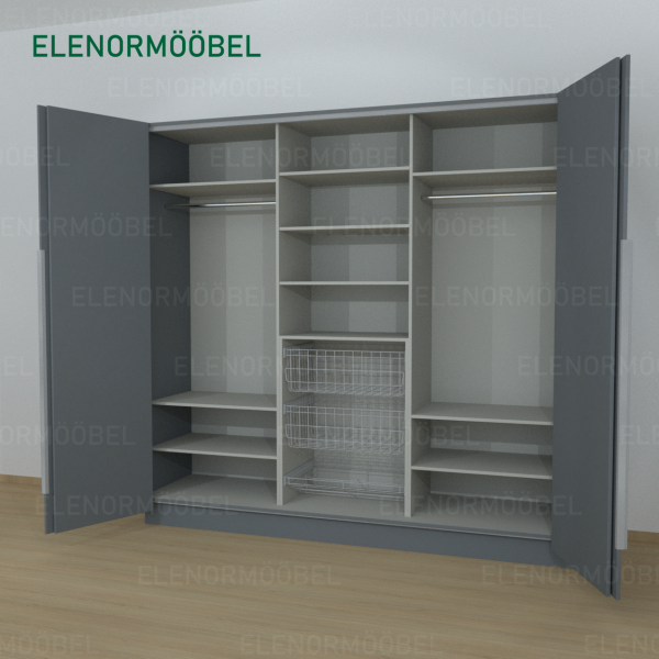 Garderoob  valmistatakse Saksa tootja Egger mööbliplaadist. Fassaad ja esipaneelid Egger U780 mööbliplaat. Tagasein, vahesinad ja riiulid Egger U763 mööbliplaat.